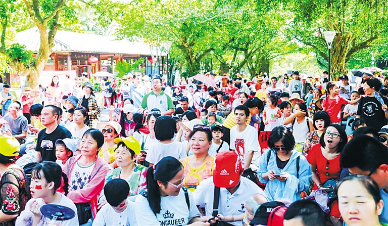 启动仪式后,丰富多样的活动让现场成为了欢乐的海洋,在热带水果推广品鉴沙龙区,火山地区种植的2000斤各类水果盛满果盘、果筐,供市民游客免费品尝;百对亲子家庭参与的火山寻宝快乐研学活动现场欢声笑语不断;不少市民游客和学生游学团还徒步登火山口、游火山石斛园,采摘火山荔枝,气氛欢快热烈。