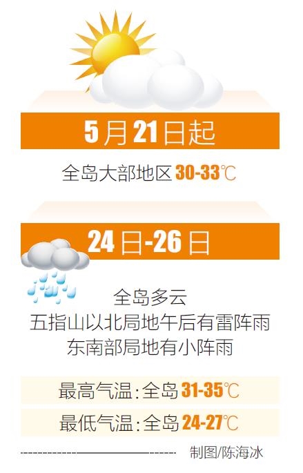 陆地方面,5月20日-23日,受弱冷空气和季风槽共同影响,全岛有阵雨或雷阵雨、局地暴雨,个别地区并伴有雷雨大风等强对流天气。最高气温20日五指山以北地区35-38℃,五指山以南地区33-36℃;21日起高温天气缓解,全岛大部地区30-33℃,最低气温全岛23-27℃。