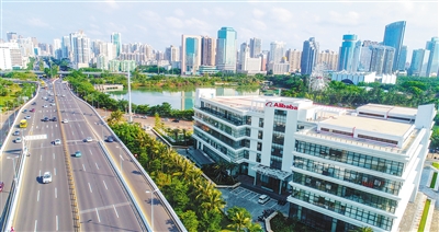 近日,鸟瞰位于海口世纪大桥边上的复兴城互联网创新创业园。目前,该园孵化区、加速区、引领区和国际离岸区已吸引阿里巴巴、蚂蚁金服、普华永道、爱奇艺、凤凰金融、滴滴出行等企业入驻,累计注册企业741家。2018年园区实现产业规模超150亿元、营收100亿元。本报记者 张茂 摄