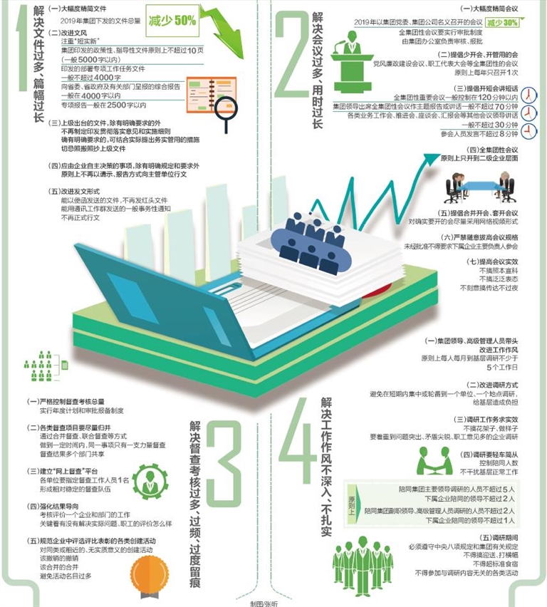 《通知》指出,从集团层面做起,大幅度精简文件,大幅度精简会议,着力解决会议过多、用时过长的问题。