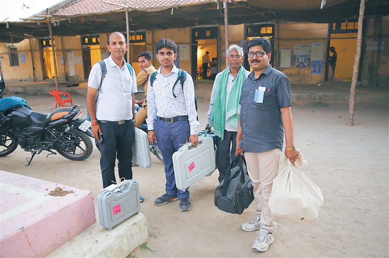 5月19日,在印度北方邦的瓦拉纳西的一处投票站外,工作人员将电子投票系统装箱准备离开。