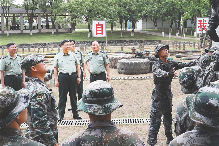 学院训练场上,学员们生龙活虎、喊声震天,一派实战化练兵景象。习近平走到障碍训练场旁,察看学员进行障碍训练情况。极限训练对于锤炼学员体能极限、意志极限、心理极限,提高战场适应能力很有意义。习近平步行进入极限训练场,详细了解有关训练设施和训练情况。学员们进行了阻绝墙跳水、翻越懒人梯、跨越步步高、翻越高墙、攀爬云梯、攀越高空荡木桥、扛圆木等训练。看到学员们摸爬滚打一身泥水,迎着障碍一往无前,习近平很高兴。