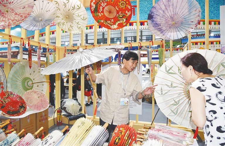 在文博会非遗展馆,来自四川泸州的油纸伞制作技艺代表性传承人毕六福(左)在向参观者介绍这一国家级非物质文化遗产项目。