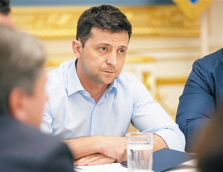 5月21日,在乌克兰基辅,乌克兰总统泽连斯基出席会议。