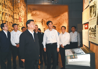 于都是中央红军长征集结出发地。1934年10月,中央机关、中央军委和中央红军主力在此集结出发,踏上漫漫征途。20日下午,习近平转乘火车来到于都县,瞻仰中央红军长征出发纪念碑,察看中央红军长征出发地旧址原于都县城东门渡口,参观中央红军长征出发纪念馆。在纪念碑前,习近平向革命先烈敬献花篮并三鞠躬。他缓步绕行纪念碑,仔细察看基座上的浮雕,深情缅怀当年党中央和中央红军在苏区浴血奋战的峥嵘岁月。纪念馆内,习近平听取中央红军长征集结出发历史情况介绍,在一张张图片、一件件实物前驻足察看,同大家不时交流,回忆当年的历史。他强调,今年是新中国成立70周年。我们一定要牢记红色政权是从哪里来的、新中国是怎么建立起来的,倍加珍惜我们党开创的中国特色社会主义,坚定道路自信、理论自信、制度自信、文化自信。革命理想高于天。理想信念之火一经点燃,就永远不会熄灭。在中央苏区和长征途中,党和红军就是依靠坚定的理想信念和坚强的革命意志,一次次绝境重生,愈挫愈勇,最后取得了胜利,创造了难以置信的奇迹。我们不能忘记党的初心和使命,不能忘记革命理想和革命宗旨,要继续高举革命的旗帜,弘扬伟大的长征精神,朝着中华民族伟大复兴的目标奋勇前进。今天,在新长征路上,我们要战胜来自国内外的各种重大风险挑战,夺取中国特色社会主义新胜利,依然要靠全党全国人民坚定的理想信念和坚强的革命意志。