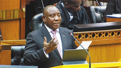 南非国民议会新当选议员22日选举执政党非洲人国民大会(非国大)推举的候选人拉马福萨为南非总统。图为拉马福萨在会议上讲话。