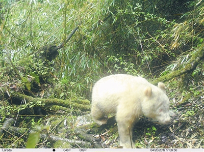 这只熊猫毛发通体呈白色、爪子也为白色,眼睛为红色,正穿过郁郁葱葱的原始落叶阔叶林。据专家分析,根据照片上这些外部特征,可以判断该熊猫是一只白化个体。从体型判断,这是一只亚成体或青年熊猫,年龄大概在1至2岁。