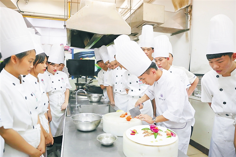 劳振兴说,6年的职校生活,他收获的不仅是系统的烹饪知识,还有严谨的态度和对职业无止境的追求。尽管毕业三年了,他依旧会要求自己每周完成一份满意的雕刻作品,每年到企业里学习1到2次。