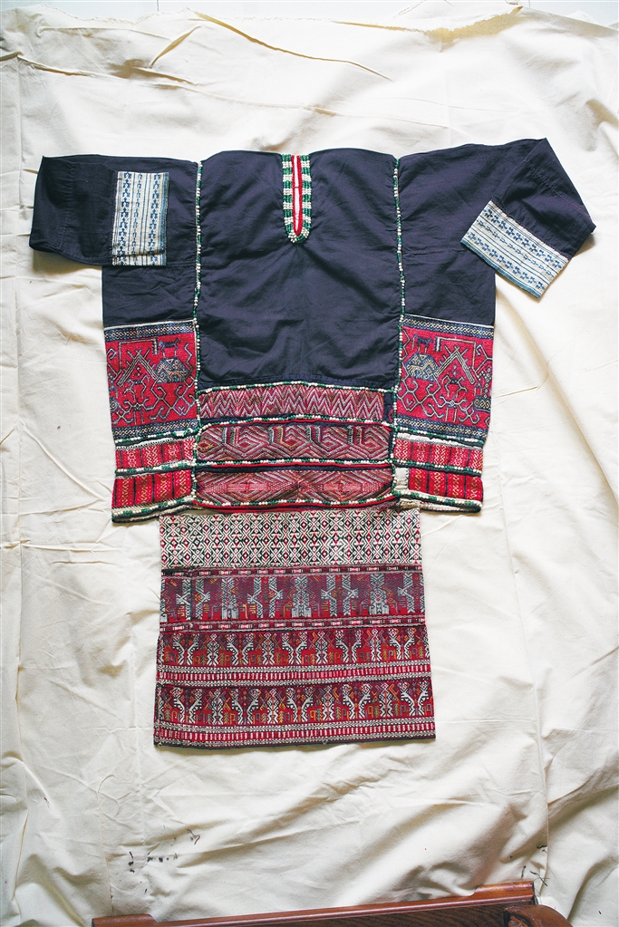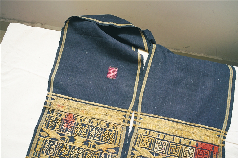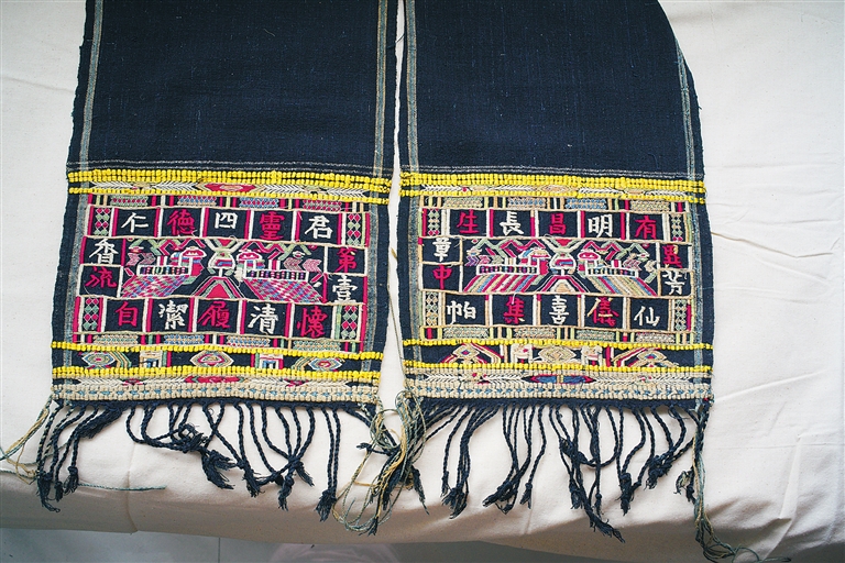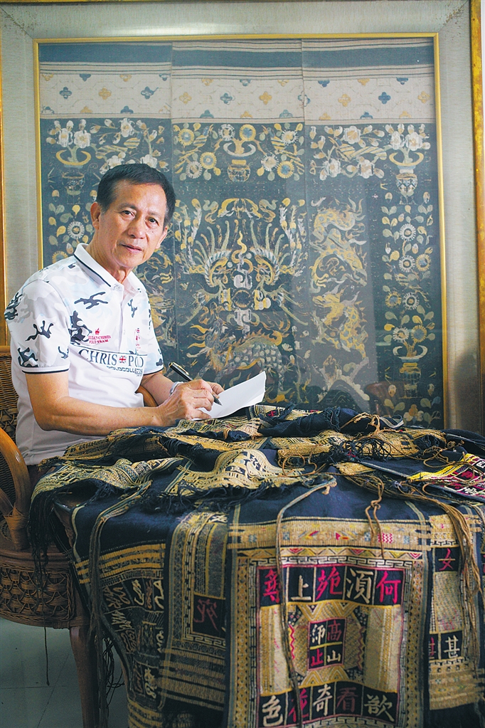 “廖善新收藏的作品品种比较多,上面所绣的文字寓意也很美好,比较难得。”王辉山此前鉴赏过廖善新的藏品,“从这一层面来说,文化融合、民族融合不仅丰富了海南黎锦的内涵,也对黎锦传统技艺产生了深远的影响。”