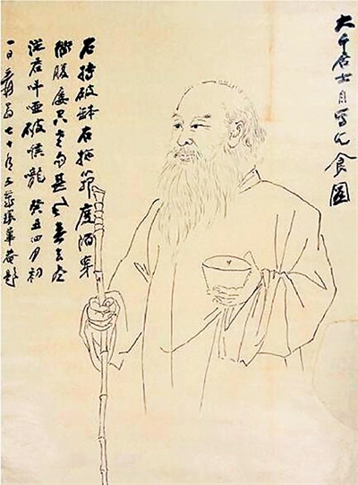这幅自画像是张大千在美国“环碧庵”所作,画中的张大千一手拖着一根竹棍,一手拿着一只破钵,作乞讨状。张大千在左上角题了四行小诗:“左持破钵右拖筇,度陌穿衢腹屡空。老雨甚风春去尽,从君叫哑破喉咙。”据知情人透露,这是张大千一生中经济上最为困难的时期。