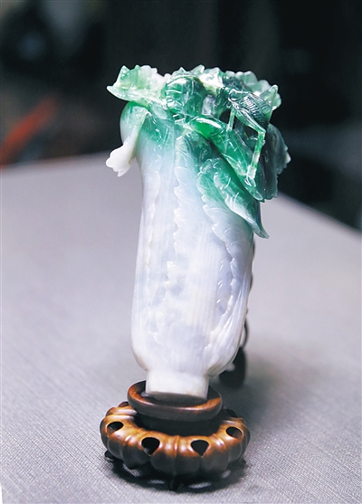 雄的蚱蜢在中国古代称为螽斯,螽斯的寓意是多子多福,因此这只翠玉白菜也寓含着多子多福的含义。白菜这一题材是清代玉石雕刻中,经常采用的一种题材,因为白菜和百财谐音,所以深得皇家的喜爱。在众多的玉石雕刻作品中,都能看到白菜的题材。而这棵翠玉白菜,关乎光绪帝的家务事,据传说是光绪皇帝的妃子瑾妃进宫时的陪嫁物。它原来摆放在紫禁城永和宫之中。1925年,溥仪被冯玉祥驱逐出紫禁城时,这位聪明的老太太瑾妃,便将身边的这个陪嫁物携带出宫,后来翠玉白菜辗转迁徙,最终落户到台北故宫博物院。