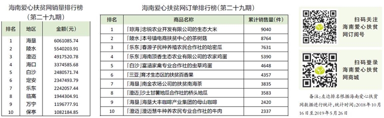 本周,海南省残疾人康复指导中心保持着稳定的购买输出,该中心主任梁云介绍,中心通过组织内部员工采购和厨房物资采购的形式助力消费扶贫,平均每月在海南爱心扶贫网上采购数额达到8000余元,其中除了组织员工采购2000多元产品外,食堂所需的油、大米、粗粮等必需品也全都采购海南爱心扶贫网农特产品。