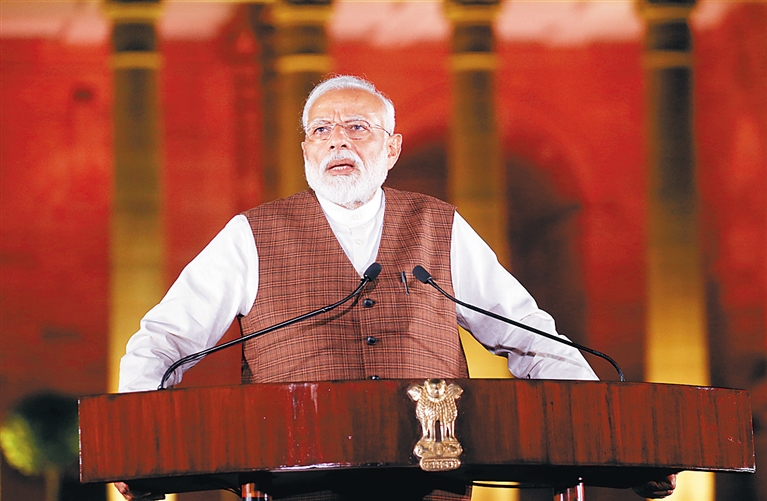 5月25日,印度总统科温德正式任命莫迪为新总理,同时要求莫迪提名新一届联邦政府内阁成员。莫迪随后发表公开讲话,确认将开启他的第二个总理任期。 新华社/路透