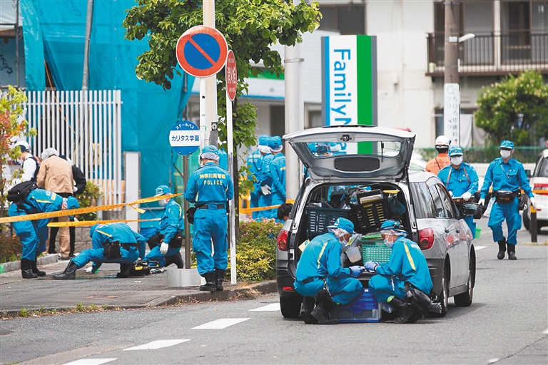 5月28日,在日本神奈川县川崎市,法医在案发现场工作。日本神奈川县川崎市28日晨发生持刀伤人事件,一名男子持刀刺伤18人,其中一名小学生和一名男性家长死亡。男子作案后试图自杀,被捕送医后死亡。 新华社/法新