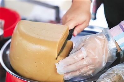 “水粑滋味可口,看似寻常,可想把它做得好吃还得花一番功夫。”吴姐介绍,事实上水粑的主材就是粟米糕,乍一看,它的制作方法和年糕有些相似,但滋味却非常独特。