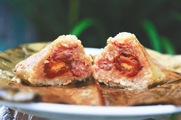 “粽子虽小,但是工序多,要有匠心精神才能把粽子包好。”工人们熟练地铺一层粽叶,倒上一层糯米,放上几块肥瘦相间的黑猪肉,再与用红泥腌制的富硒咸鸭蛋黄糅合在一起,巧手一收一拢间,一个个紧实精致的五角粽子便成型了。此后,还需用大火蒸煮10余个小时,粽子才能出炉。