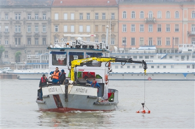5月30日,在匈牙利布达佩斯,工作人员进行搜救作业。匈牙利首都布达佩斯多瑙河上29日晚发生两艘游船相撞事故,其中一艘游船沉没。事故造成至少7人死亡,另有多人失踪。新华社发