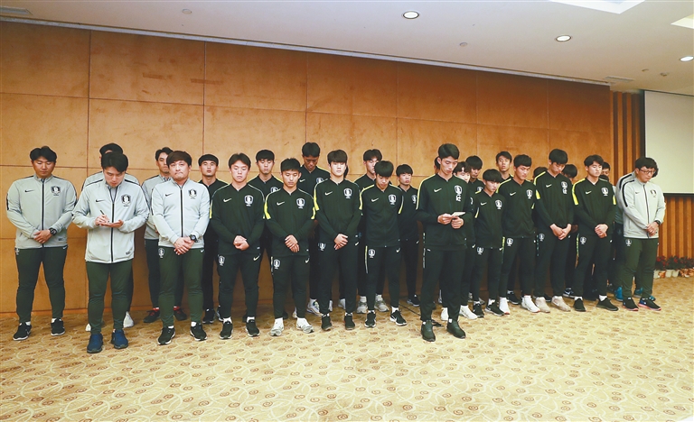 5月29日晚,中国足协就韩国球员赛后对“熊猫杯”奖杯做出的侮辱行为,立即对韩国参赛队伍进行了严正抗议和交涉,韩国队返回酒店后立即召开新闻通气会对媒体和公众进行公开道歉。图为5月30日,韩国U18国家队在成都召开新闻发布会再次致歉。 新华社发