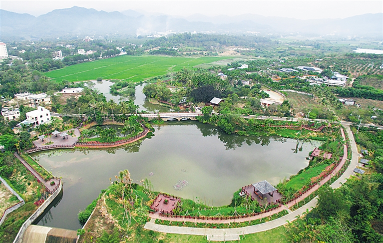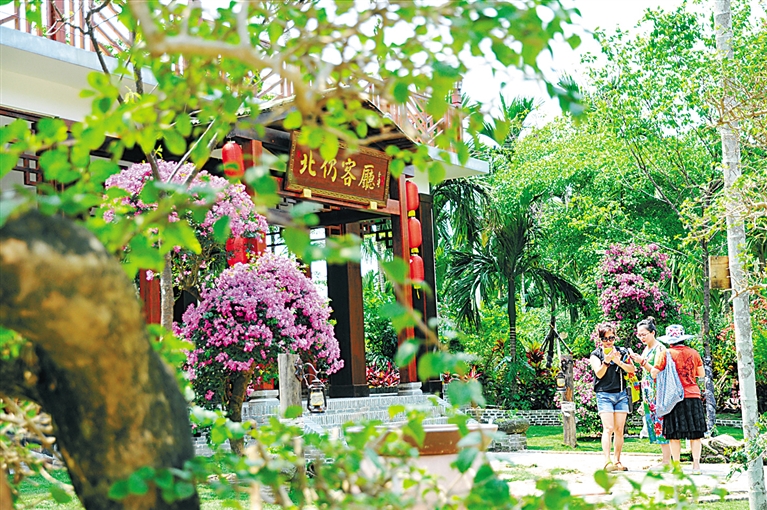 看得见山,望得见水,留得住乡愁。“村游”是近几年琼海旅游的流行词。北仍村景观设计时尚又古朴,一处设施一个点缀,看似是随意而为,却又是匠心独运。槟榔、椰子树环抱着村庄,古朴的民居与田园密林相映成趣。村里不设围墙,天地密林就是天然屏障。你可以绕着环村8公里的绿道骑行,可以在草寮咖啡屋和好友闲聊打发时间,也可以到槟榔林中的乡愁味道农家乐、北仍大客厅去品味地道的乡村美食。