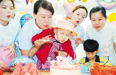 5月30日下午,在省肿瘤医院血液淋巴瘤科,即将出院的小金子(化名)和护士姐姐一同吹蜡烛,庆祝“六一”儿童节。7岁的小金子去年10月确诊患上儿童急性淋巴细胞白血病,经过6次化疗后,病情得到有效控制。