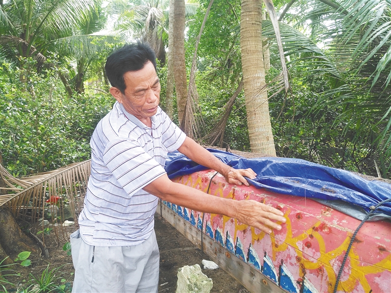 在宝玉村海边的椰林里,当年经历过几次大型比赛的3艘龙舟被小心翼翼地用塑料膜包裹着,其中2艘木制龙舟是张其和与村民们一起亲手造出来的,掀开包裹膜,能看见油漆画的龙鳞。还有一艘是玻璃钢制的龙舟,那是代表海南去福建泉州比赛时,省农业厅赠送的。平日无事,张其和会常常过去察看,生怕台风暴雨天气打坏了这些龙舟。
