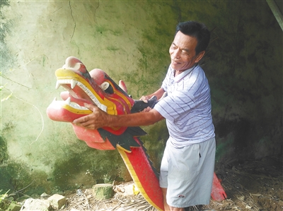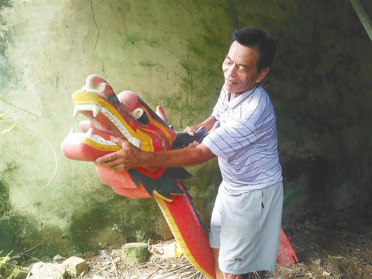 龙舟的龙头和龙尾被放在村内一处闲置的房屋里,红色的油漆依旧鲜艳无比。“之前我们队员也商量过,把龙头和龙尾搬到更结实的新房里,但又想到,这不是普通的物件,所以最终没有轻易移动,一直放在这里。”看到存放龙头和龙尾的房子有些破败,张其和颇显惆怅。他忍不住伸手将龙头上的灰尘轻轻擦拭掉。