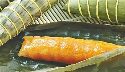 急急捞起一个粽子,眼睛常被烫手的热气迷住,但鼻子早已闻到了那淡淡的清香。剥开粽叶后,只见粽子金灿鲜亮、晶莹剔透,用一根丝线缠在粽子上,轻轻一拉,一片薄薄的粽片落入盆中,蘸上白糖、红糖或者蜂蜜再入口,只觉滑爽清香,甜而不腻。