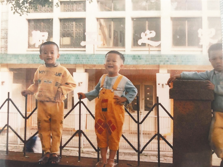 这张照片拍摄于1995年,身着黄色背带裤、长袖T恤,脚踩塑料凉鞋的便是照片的主人王禾禾,他是原琼山市龙塘糖厂的一名职工子弟,旁边的人是他的童年玩伴。