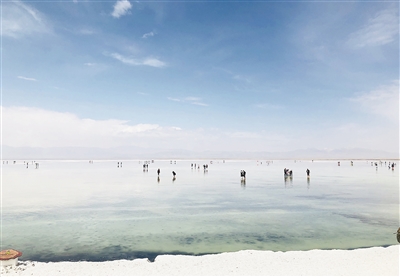 园区火车缓缓沿着古老的铁道行驶,将我们送到了湖中心。茶卡盐湖一望无际,四周一座座高山拔地而起,巍峨的山姿清晰地倒映在湖面,颇为壮观。洁白的盐田犹如铺了一地的棉花,又仿佛冰封雪盖的原野。一袭红裙少女,正在湖面上翩翩起舞,婀娜多姿,在蓝天白云映衬下美丽动人。