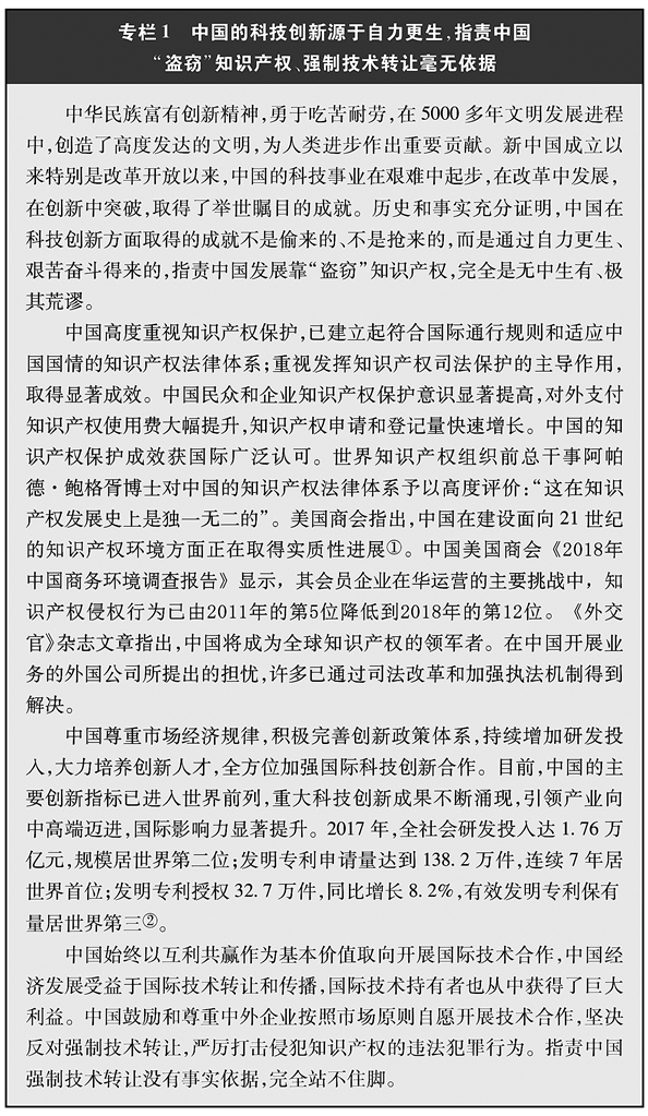 现任美国政府奉行“美国优先”政策,对外采取一系列单边主义和保护主义措施,动辄使用关税“大棒”,将自身利益诉求强加于他国。美国启用尘封多年的“201调查”“232调查”等手段,对各主要贸易伙伴频频出手,搅乱全球经贸格局。美国还将矛头对准中国,于2017年8月启动单边色彩浓厚的“301调查”,无视中国多年来在加强知识产权保护、改善外资营商环境等方面的不懈努力和取得的巨大成绩,对中国作出诸多不客观的负面评价,采取加征关税、限制投资等经贸限制措施,挑起中美经贸摩擦。