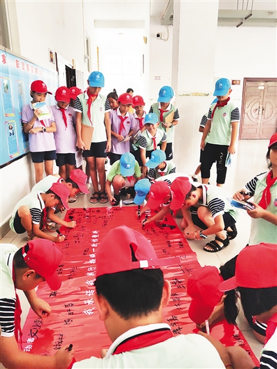 当天下午,洋浦经济开发区环保局工作人员联合洋浦一小师生开展百人签名活动。活动围绕“禁塑”展开,以环保宣传进校园的方式,呼吁大家不使用一次性不可降解塑料制品,共同保护赖以生存的地球家园。