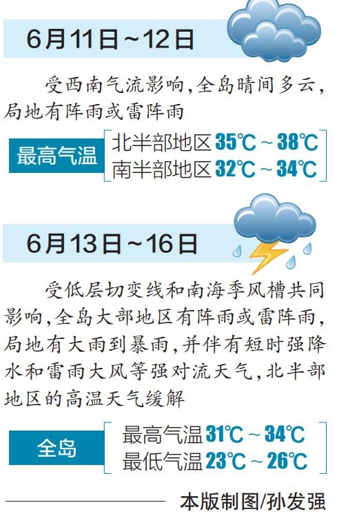 本报海口6月10日讯 (记者叶媛媛 通讯员吴洁飞 李凡)海南日报记者6月10日从省气象台了解到,预计本周前期全岛晴热少雨,北半部地区气温较高;中后期全岛有阵雨或雷阵雨,局地伴有短时强降水和雷雨大风等强对流天气,高温天气缓解。