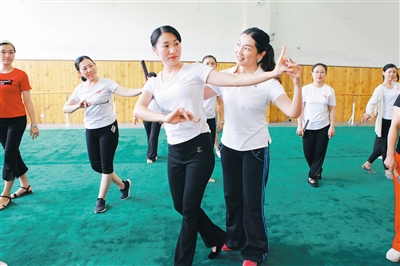 图为参加培训的学员在老师的指导下学习戏曲表演。