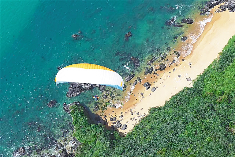 想像飞翔的鸟儿一般看海?除了三亚等地的直升机低空飞行外,一些向往新奇旅游体验的游客寻觅到了新的玩法——在绿草如茵的起飞场上,在教练的帮助下穿戴好装备、头盔、系好伞绳,随后两人朝着山坡下奋力奔跑,在滑翔伞的带动下飞向高空,开启空中之旅……