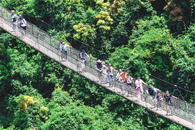 走完了雨林栈道,开始踏上的山路多以泥坑为落脚点,还有奇形怪状的树枝作为抓手,很多地方都得手脚并用,山上安置的梯子给登山者提供了方便,但爬梯也需要谨慎小心,因为最险的梯子坡度接近90度,名为“飞龙走壁”。在这样艰难的爬山条件下,拥有同伴的支持和鼓励就尤为重要了。