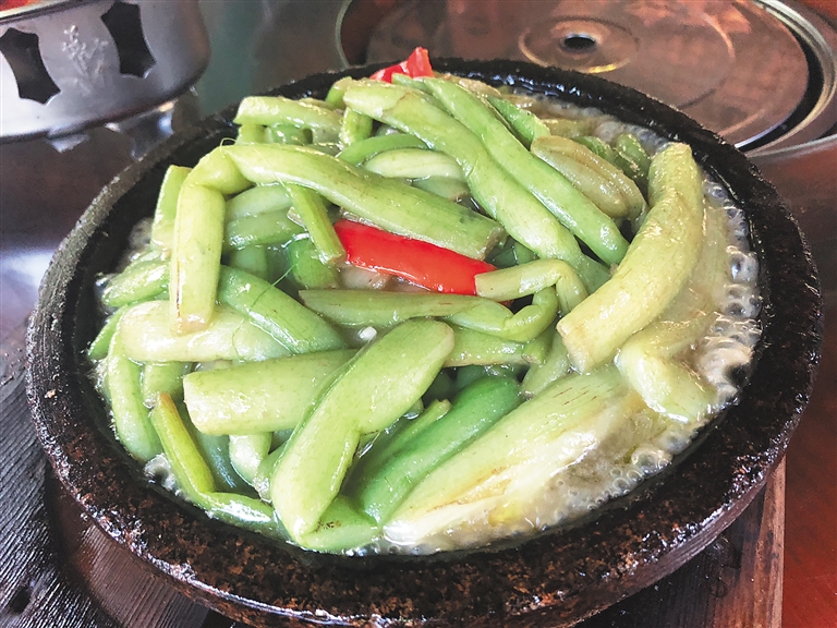 “铁板鲜芋梗来咯。”服务员的一声叫唤打破了餐桌上的寂静,同样被唤醒的还有食客的味蕾。刚端上桌的铁板鲜芋梗还盖着铁质盖子,服务员说,这样盖着,一方面是防止在端菜时被汤汁溅到烫伤,另一方面则是能更好地锁住香味。