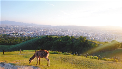 登上山顶,便可将古都的景色尽收眼底,远处的山、茂密的树、缓行的公交车和市区的房子都变得小小的。山顶有一片空地,这里的游人更为稀少,十几头小鹿在专心地吃草,山间还不时传来乌鸦的叫声,微风习习,伴着斜阳,格外惬意。在这里,无须担心有游人会误闯进镜头,举起手中的相机随手一拍,都是一幅绝美的画面。