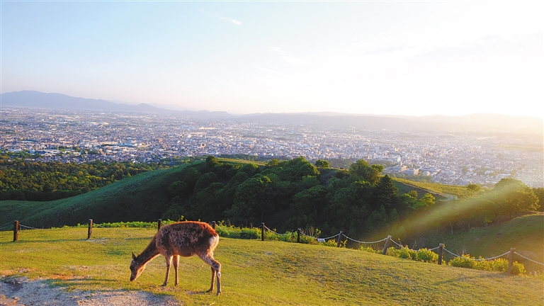 傍晚时分,暮色渐渐弥漫开来,群山若隐若现,远处的街市和建筑亮起了灯火。落日、鹿群、草坪,俯瞰着奈良从夕阳西下到万家灯火,目之所及皆为美好。