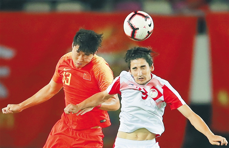 6月11日,在广州天河体育场举行的国际足球热身赛中,中国队1:0战胜塔吉克斯坦队。图为中国队球员高准翼(左)与塔吉克斯坦队球员拉弘基尔·埃加舍夫争顶。 新华社发
