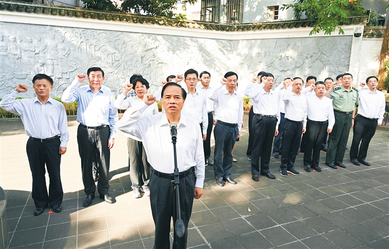 位于海口市竹林里的中共琼崖一大会址,是琼崖革命“二十三年红旗不倒”的策源地,党的十九大以来已接待单位团体5900多个、党员群众35万多人次。大家在此详细了解中共琼崖地方组织的创建发展历程。在海南党组织的诞生地,面对鲜艳的党旗,刘赐贵带领全体同志举起右拳,重温入党誓词。