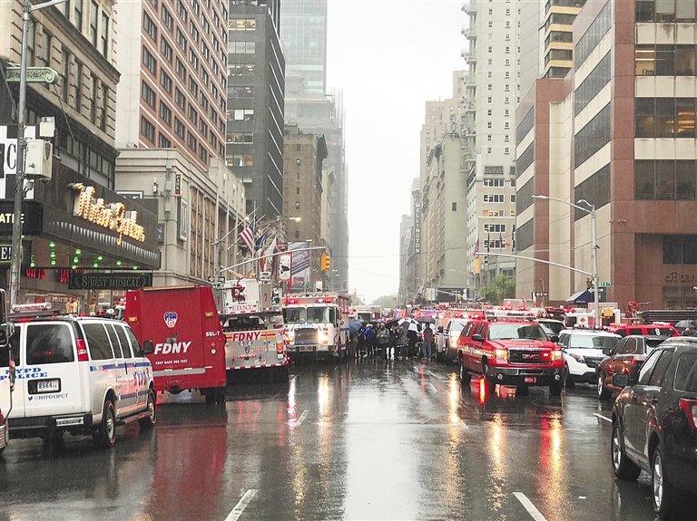 6月10日,在美国纽约曼哈顿,警车和应急车辆停在事发写字楼附近的街道上。 坠机事故发生在美国东部时间10日下午1时45分左右,一架直升机在曼哈顿第七大道一座大厦楼顶坠毁并起火,飞行员丧生。新华社发