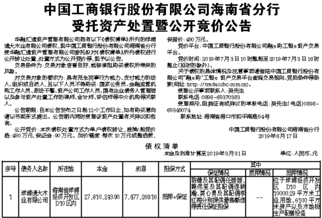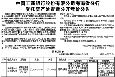 中国工商银行股份有限公司海南省分行受托资产处置暨公开竞价公告