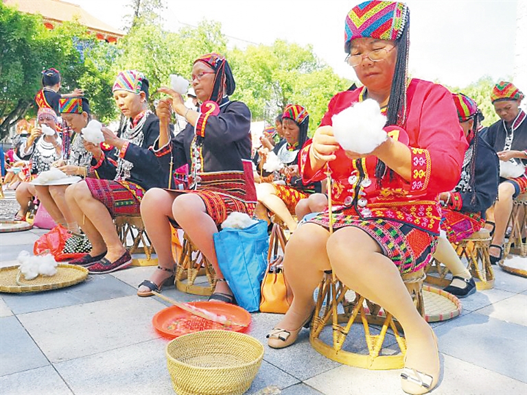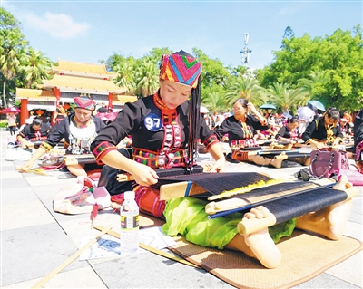 20岁的黎族女孩洪盼喜用脚趾撑住支架立腰而坐,竹针翻飞间,几根彩线往复穿梭跳跃。与她相邻的长桌上,身躯玲珑的玩偶娃娃摆出各种姿势,将一件件迷你版的黎锦筒裙与苗族刺绣衬得轻盈灵动……6月6日上午,由五指山市人民政府主办的2019年“文化和自然遗产日”系列活动在五指山市三月三广场拉开帷幕,黎族传统“纺染织绣”四大技艺比赛、黎族竹木器乐展示、舂米比赛等环节轮番上演,在山城掀起一股“最炫民族风”。
