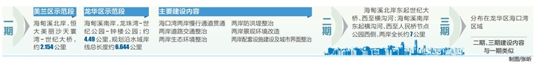 一期启动美兰区及龙华区示范段,其中美兰区示范段(海甸溪北岸,恒大美丽沙天寰湾-世纪大桥)约2.154公里,龙华区示范段(海甸溪南岸,龙珠湾-世纪公园-钟楼公园)约4.49公里,规划沿水域岸线总长度约6.644公里。主要建设内容包括海口湾两岸慢行通道贯通、两岸防洪堤整治、两岸道路交通整治、两岸景观环境改造、两岸生态环境整治、两岸配套设施建设及城市界面整治。