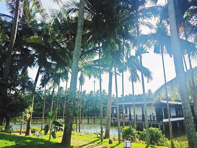 在热带花果观光园内已建好的游客中心,黑瓦白墙、飞檐翘角的徽派建筑掩映在槟榔林和绿树丛中,木栈道从波光粼粼的水面上穿过,连接具有江南庭院特色的水上餐厅,令人感受到自然之景与建筑结合的古朴之美。