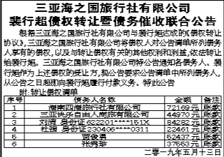 海南海世界旅行社有限公司三亚分社裴行超债权转让暨债务催收联合公告