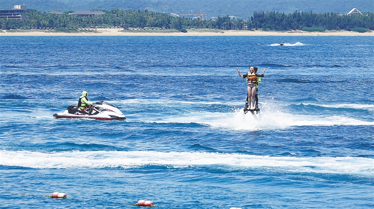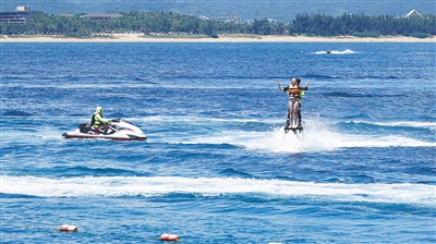 山、海、天一线间,有人乘坐动感飞艇,在水面上或疾驶而过或回转漂移,畅快而刺激;有人借助快艇在海上的牵引力和风力,乘伞升上空中,俯视山海天……“作为国家首批体育旅游示范基地及2018中国体育旅游博览会体育旅游精品景区,蜈支洲岛每年创新研发、引进两至三个水上运动项目,加深体育产品的体验度和民众普及率。”三亚蜈支洲岛旅游区运营总监鲍永洲介绍,蜈支洲岛以差异化运动体验为特点,推出30余种游乐项目,其中水上运动项目有20余种,极限运动达12项,每年吸引着超过60万人次游客前来体验水上体育的乐趣。2018年,该景区水上运动项目收入超过8亿元。