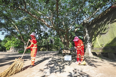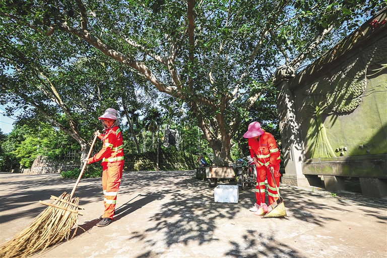 6月18日9时许,在海口市龙华区新坡镇仁里村的村道上,一辆挖掘机正在铲除道路两旁的蒲苇、飞机草、岩石等杂草杂物。沿着村道蜿蜒而去,一路上视野里尽是绿色,槟榔、菠萝蜜、黄皮、龙眼、野荔枝等成行连片,只有走近了仔细看,才发现一栋栋火山岩石屋、水泥楼房掩映在绿色当中。