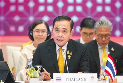 6月22日,在泰国曼谷,泰国总理巴育出席第34届东盟峰会全体会议。