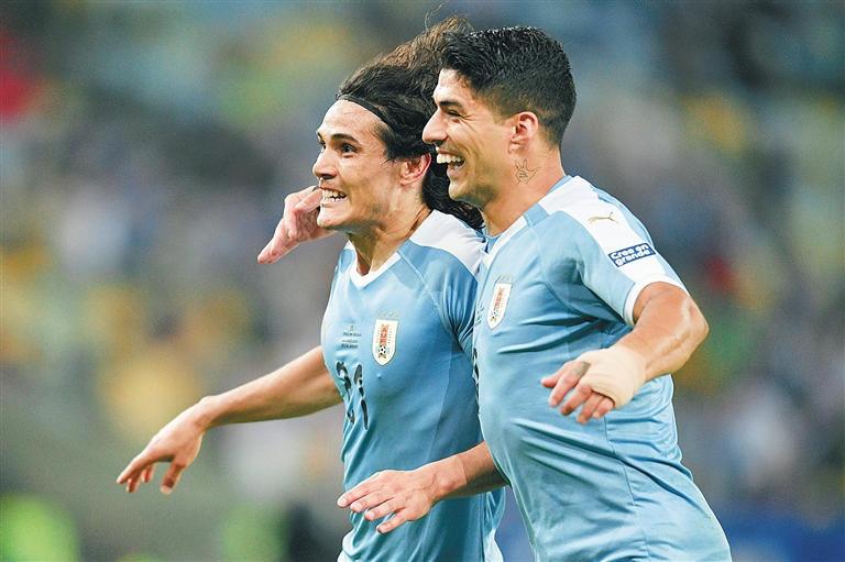 6月24日,在巴西里约热内卢举行的2019美洲杯足球赛小组赛C组比赛中,乌拉圭队以1:0战胜智利队。图为乌拉圭队球员卡瓦尼(左)和苏亚雷斯在比赛中庆祝进球。 新华社发